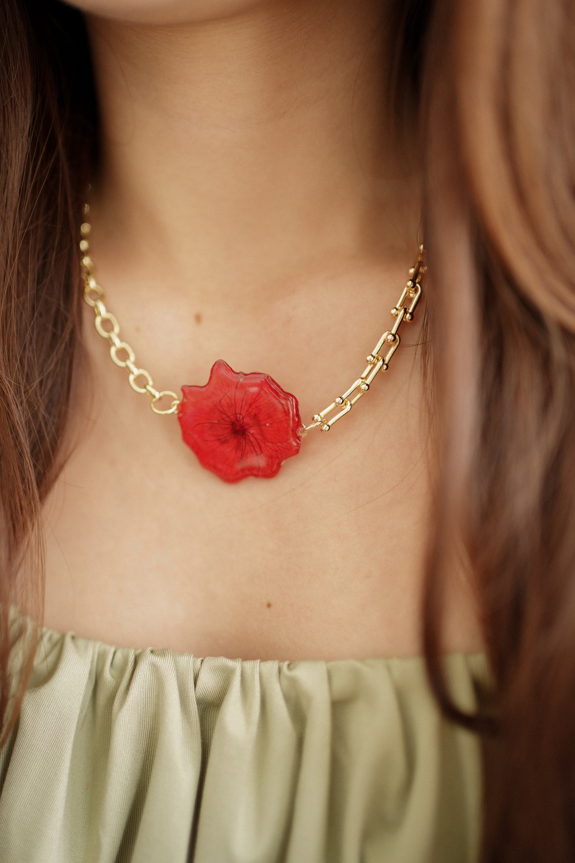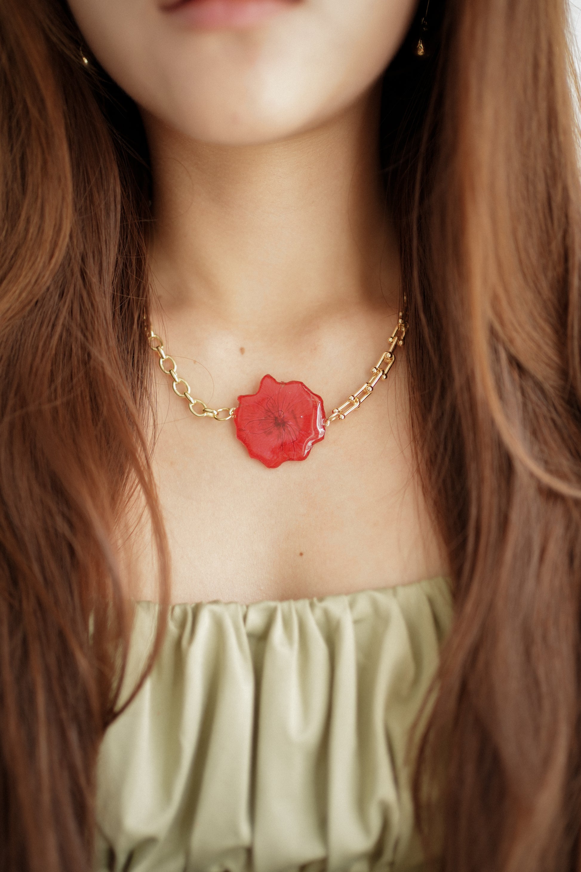 Add an elegant touch to your outfit with our Cherry Blossom Dual Chain Necklace! The chic and classy design features two delicate chains and a meticulously preserved red cherry blossom flower encased in resin. Elevate your accessories and embrace the beauty of nature with this one-of-a-kind necklace.